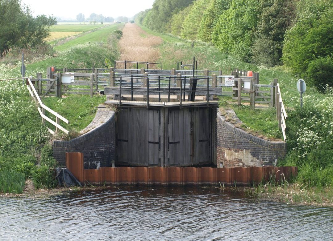 Lock![]() The original lock was built in 1651 when Vermuyden dug the Forty Foot Drain, aka Vermuyden's Drain, (top of photo, now overgrown with reeds) from Ramsey to here to drain waters from the Middle Level into the Old Bedford River (bottom of photo) thence to sea via the Old Bedford Sluice at Salters Lode and the Great Ouse River. Known as the Forty Foot Lock, it was rebuilt in 1991 by the National Rivers Authority (NRA). Since 1997 is has been owned by the NRA's successors, the Environment Agency (EA) which now calls it Welches Dam Lock. In 1996 an NRA report stated that high seepage losses of water in the Forty Foot River made it impractical to keep the channel open for navigation at all times. Entry into the Forty Foot from the OBR would be arranged in agreement with the Inland Waterways Association (IWA) on about 20 week-ends a year, assuming sufficient water available [from the OBR ?] to fill it. It was still navigable, with difficulty, in 2001 - see Tuesday Night Club cruise page for full report on a trip from the 16 Ft Drain to the Old Bedford with lots of photos. However a few years later the lock was sealed off with steel piles, and so it remains today. |