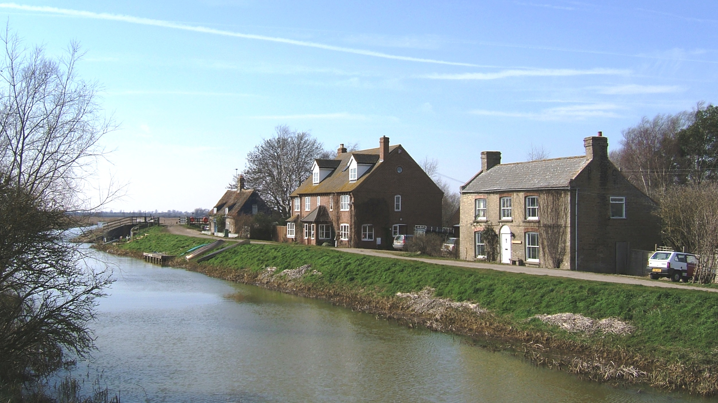 Welches Dam AreaIntroductionWelches Dam is an area in Cambridgeshire, England, alongside the Old Bedford, Counter Drain and Delph rivers. Once a civil parish, it is now part of the parish of Manea.It takes its name from a dam that was built here in 1651 when a channel called the Forty Foot or Vermuyden's Drain was cut to drain water from Ramsey into the Old Bedford River. There hasn't been an actual dam for perhaps 250 years (lots of suposition but little evidence), but there are two pumping stations (yes!) a few houses (four, I think), a disused lock, several bridges and a large nature reserve run by the RSPB and Wildlife Trusts. ![]() Photo: EE, March 2006 The west bank of the Counter Drain looking South. From left to right: in the distance is the lock entrance with a bridge over it; next is the quaint old Lock-keepers Cottage. In Victorian times once a Pub. A property named "The Three Fishers"is shown on modern OS maps used by planning authorities. Property last sold in 1998; then Adventurers House, a private house built in 1972; nearest is a house named Princess Victoria, also once a pub, now an RSPB Wardens home. The Pub was refered to on a Victorian OS map as "Queen Victoria" |