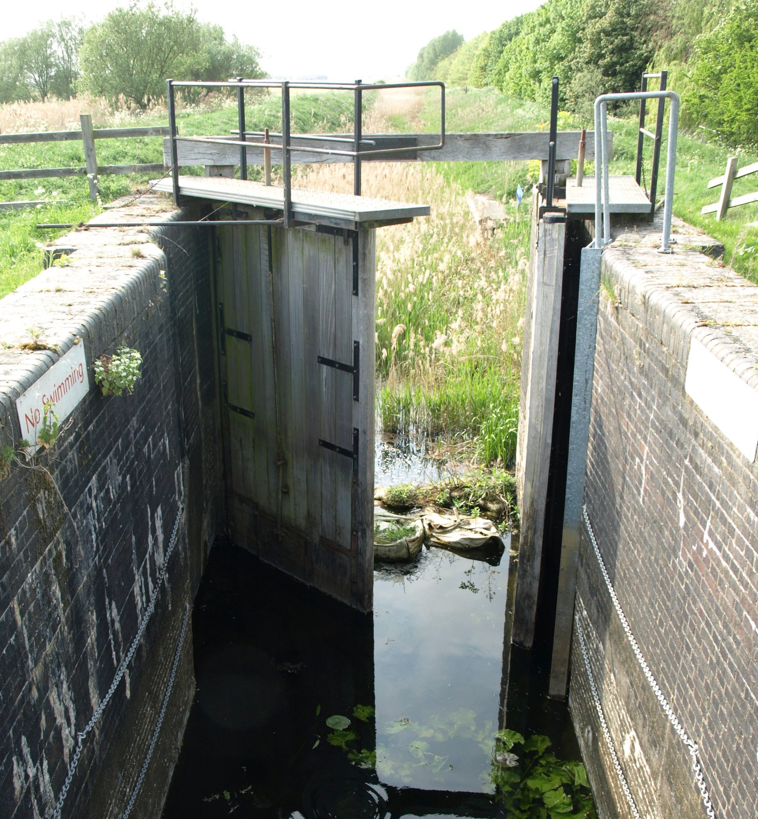 Photo: EE, Apr 2011 The original lock was built in 1651 when Vermuyden dug the Forty Foot Drain, aka Vermuyden's Drain, (top of photo, now overgrown with reeds) from Ramsey to here to drain waters from the Middle Level into the Old Bedford River (bottom of photo) thence to sea via the Old Bedford Sluice at Salters Lode and the Great Ouse River. Known as the Forty Foot Lock, it was rebuilt in 1991 by the National Rivers Authority (NRA). Since 1997 is has been owned by the NRA's successors, the Environment Agency (EA) which now calls it Welches Dam Lock. In 1996 an NRA report stated that high seepage losses of water in the Forty Foot River made it impractical to keep the channel open for navigation at all times. Entry into the Forty Foot from the OBR would be arranged in agreement with the Inland Waterways Association (IWA) on about 20 week-ends a year, assuming sufficient water available [from the OBR ?] to fill it. It was still navigable, with difficulty, in 2001 - see Tuesday Night Club cruise page for full report on a trip from the 16 Ft Drain to the Old Bedford with lots of photos. However a few years later the lock was sealed off with steel piles, and so it remains today. |