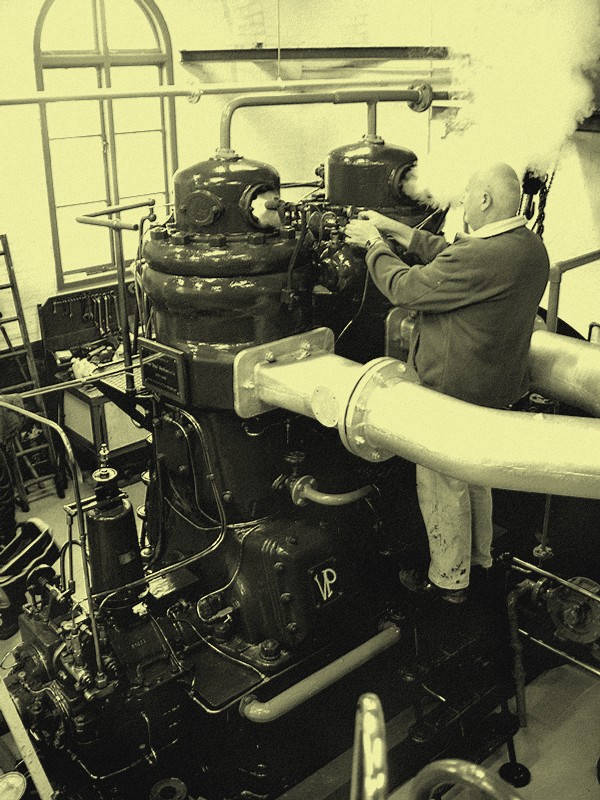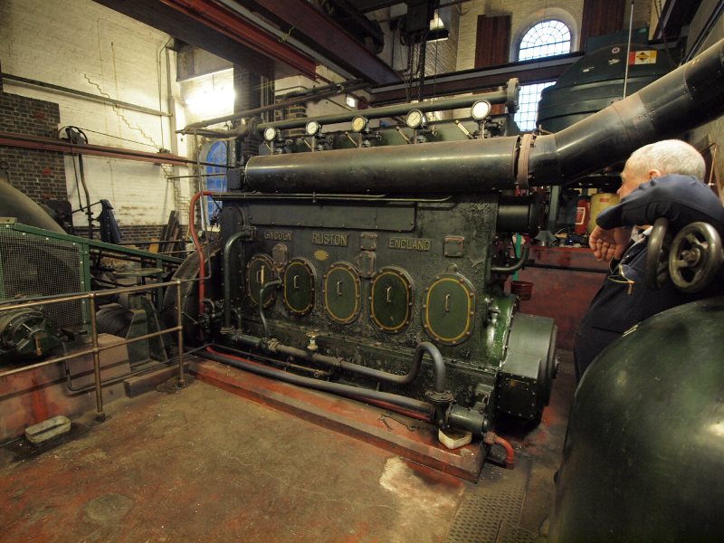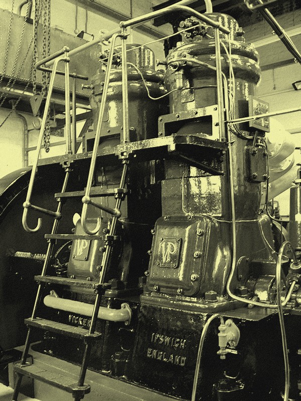 Two 4-cyl vertical 2-stroke diesel engines rated at 250hp were installed in 1927, each driving a 42inch Gwynnes centrifugal pump discharging 150 tpm3.These engines used the "hot-bulb" method of ignition, which involved starting with compressed-air driven paraffin blow lamps fitted at the top of each cylinder.