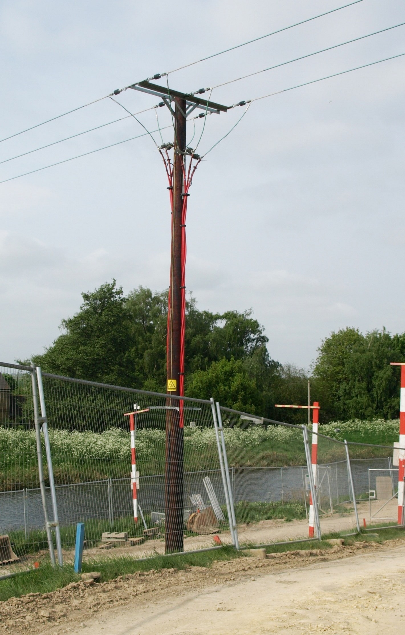 The line comes over the Washes from Ely (left). In autumn 2009 EDF Energy upgraded it to 11kV-400V, the standard secondary distribution voltage and installed a new pole on the bank (right) from which underground cable was laid to the station's new 1,000kVA transformer at the NE end of site.When the EA were challenged about the reduced capacity, they said the supply had been upgraded to the maximum possible which was sufficient for only 4 pumpsets.